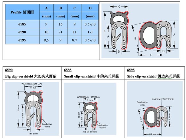 這個系列的容易裝配的夾式墊圈由一個分開的海綿狀橡皮水封和一個EMI屏蔽側邊的高度導電的,抗磨損的用金屬處理的織物組成。結構是非常軟的由于是空的橡膠,因此確保了一個低的閉合力。